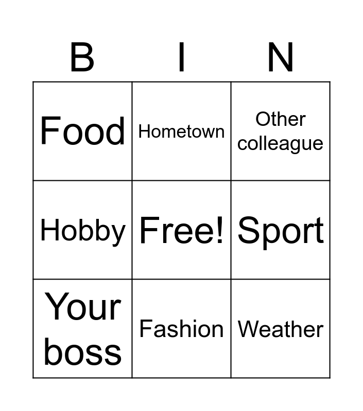 This bingo card has a free space and 9 words: Your boss, Other colleague, Hometown, Hobby, Food, Sport, Weather, Music and Fashion.