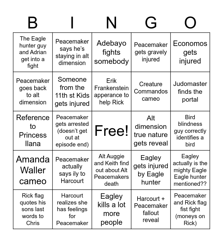 This bingo card has a free space and 24 words: Peacemaker actually says ily to Harcourt, Harcourt realizes she has feelings for Peacemaker, Erik Frankenstein apperance to help Rick, Rick flag quotes his sons last words to Chris, Economos gets injured, The Eagle hunter guy and Adrian get into a fight, Peacemaker goes back to alt dimension, Peacemaker says he’s staying in alt dimension, Alt dimension true nature gets reveal, Alt Auggie and Keith find out about Alt Peacemakers death, Creature Commandos cameo, Reference to Princess Ilana, Eagley gets injured by Eagle hunter, Eagley actually is the mighty Eagle Eagle hunter mentioned??, Someone from the 11th st Kids gets injured, Harcourt + Peacemaker fallout reveal, Bird blindness guy correctly identifies a bird, Adebayo fights somebody, Judomaster finds the portal, Peacemaker gets arrested (doesn’t get out at episode end), Peacemaker and Rick flag fist fight (moneys on Rick), Amanda Waller cameo, Peacemaker gets gravely injured and Eagley kills a lot more people.