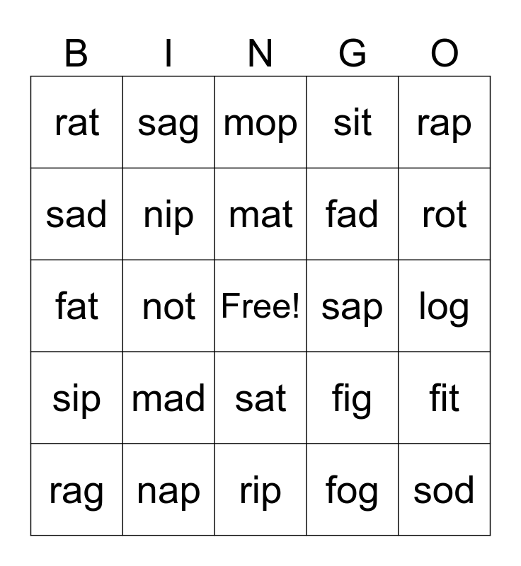 This bingo card has a free space and 24 words: mad, nap, mat, rag, rap, rat, sad, sag, sap, sat, fad, fat, fig, fit, nip, fog, log, mop, rot, not, sod, sip, sit and rip.