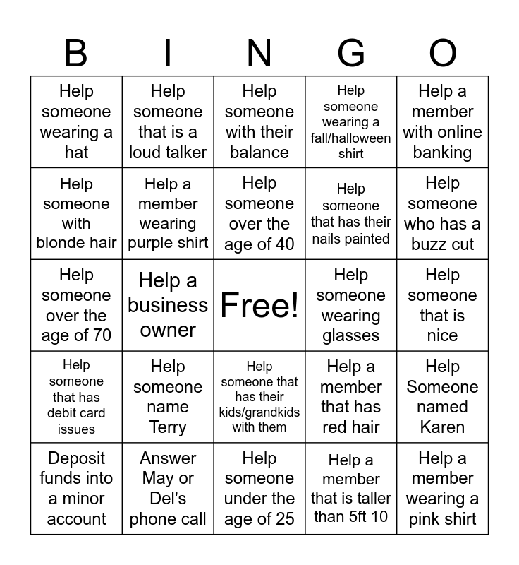This bingo card has a free space and 24 words: Help someone name Terry, Answer May or Del's phone call, Help someone over the age of 40, Deposit funds into a minor account, Help a member with online banking, Help someone wearing a hat, Help someone with blonde hair, Help someone that is a loud talker, Help someone wearing glasses, Help someone that has their kids/grandkids with them, Help someone that has their nails painted, Help someone over the age of 70, Help a member that has red hair, Help Someone named Karen, Help a member wearing purple shirt, Help a member that is taller than 5ft 10, Help someone that is nice, Help someone with their balance, Help someone who has a buzz cut, Help a business owner, Help a member wearing a pink shirt, Help someone that has debit card issues, Help someone wearing a fall/halloween shirt and Help someone under the age of 25.