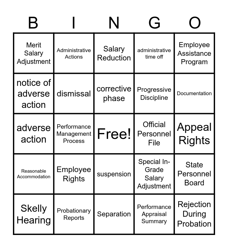 This bingo card has a free space and 35 words: absence without leave, entitlement rights, demotion, dismissal, suspension, administrative time off, notice of adverse action, preventive phase, corrective phase, PM specialist, adverse action, Employee Assistance Program, Family and Medical Leave, Memorandum of Understanding, Merit Salary Adjustment, Official Personnel File, Performance Appraisal Summary, Performance Management Process, Reasonable Accommodation, Rejection During Probation, Special In-Grade Salary Adjustment, Skelly Hearing, State Personnel Board, Probationary Reports, Salary Reduction, Documentation, Expectations Guidelines, Recap Emails, Progressive Discipline, Appeal Rights, Training, Separation, Employee Rights, Administrative Actions and Constructive Feedback.