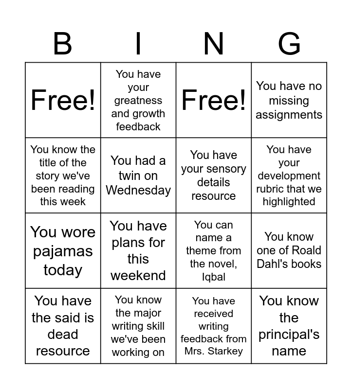 This bingo card has 16 words: You have the said is dead resource, You know the major writing skill we've been working on, Free!, You have no missing assignments, You know the title of the story we've been reading this week, You have your greatness and growth feedback, You can name a theme from the novel, Iqbal, You know one of Roald Dahl's books, Free!, You had a twin on Wednesday, You have received writing feedback from Mrs. Starkey, You have your development rubric that we highlighted, You wore pajamas today, You have plans for this weekend, You have your sensory details resource and You know the principal's name.
