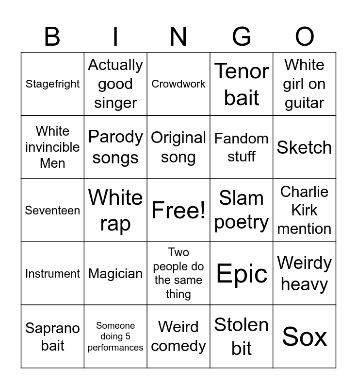 This bingo card has a free space and 27 words: Epic, Theater kid, Fandom stuff, Weird comedy, White invincible Men, Crowdwork, Actually good singer, Instrument, Slam poetry, Weirdy heavy, Seventeen, Tenor bait, Saprano bait, Someone doing 5 performances, Sketch, Cringe, Parody songs, Original song, Magician, Stagefright, Charlie Kirk mention, Stolen bit, White rap, Sox, Two people do the same thing, White girl on guitar and White girl on ukulele.