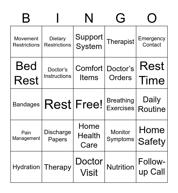 This bingo card has a free space and 33 words: Medication, Follow-up Appointment, Rest, Physical Therapy, Pain Management, Doctor’s Instructions, Emergency Contact, Hydration, Dietary Restrictions, Temperature, Comfort Items, Support System, Pediatrician, Vaccinations, Breathing Exercises, Rest Time, Therapy, Bandages, Discharge Papers, Monitor Symptoms, Home Health Care, Temperature Check, Movement Restrictions, Daily Routine, Doctor Visit, Follow-up Call, Therapist, Doctor’s Orders, Bed Rest, Home Safety, Healing, Nutrition and Rest Time.
