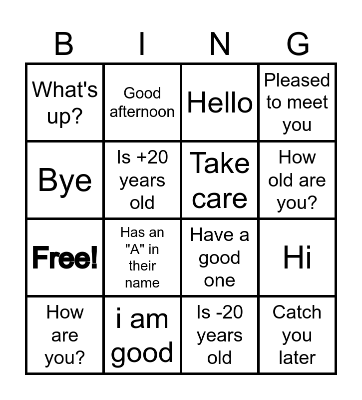 This bingo card has 20 words: Hi, Hey there, Hello, Nice to meet you, How are you?, Bye, i am good, What's up?, Free!, Good afternoon, Has an "A" in their name, Have a good one, Is +20 years old, Catch you later, Take care, Have a nice day, How old are you?, Pleased to meet you, Is -20 years old and Has an "I" in their name.