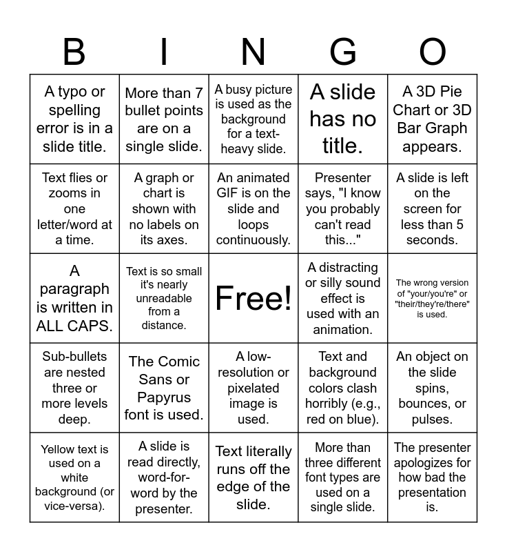 This bingo card has a free space and 24 words: The Comic Sans or Papyrus font is used., A slide is read directly, word-for-word by the presenter., An animated GIF is on the slide and loops continuously., Yellow text is used on a white background (or vice-versa)., A 3D Pie Chart or 3D Bar Graph appears., A typo or spelling error is in a slide title., Text flies or zooms in one letter/word at a time., More than 7 bullet points are on a single slide., A distracting or silly sound effect is used with an animation., A low-resolution or pixelated image is used., Presenter says, "I know you probably can't read this...", A paragraph is written in ALL CAPS., Text and background colors clash horribly (e.g., red on blue)., An object on the slide spins, bounces, or pulses., A graph or chart is shown with no labels on its axes., More than three different font types are used on a single slide., The wrong version of "your/you're" or "their/they're/there" is used., A busy picture is used as the background for a text-heavy slide., A slide is left on the screen for less than 5 seconds., Text is so small it's nearly unreadable from a distance., The presenter apologizes for how bad the presentation is., Sub-bullets are nested three or more levels deep., A slide has no title. and Text literally runs off the edge of the slide..