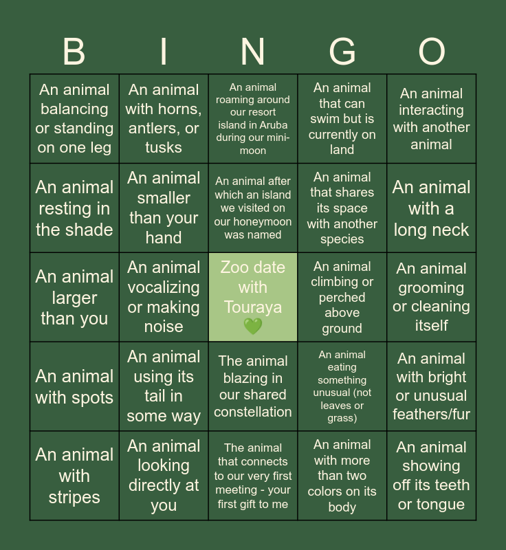 This bingo card has a free space and 24 words: An animal with stripes, An animal using its tail in some way, An animal after which an island we visited on our honeymoon was named, An animal with more than two colors on its body, An animal interacting with another animal, An animal balancing or standing on one leg, An animal with horns, antlers, or tusks, An animal roaming around our resort island in Aruba during our mini-moon, An animal climbing or perched above ground, An animal grooming or cleaning itself, An animal larger than you, An animal smaller than your hand, An animal eating something unusual (not leaves or grass), An animal with bright or unusual feathers/fur, An animal resting in the shade, An animal looking directly at you, The animal that connects to our very first meeting - your first gift to me, An animal that can swim but is currently on land, An animal with a long neck, An animal with spots, An animal vocalizing or making noise, The animal blazing in our shared constellation, An animal that shares its space with another species and An animal showing off its teeth or tongue.