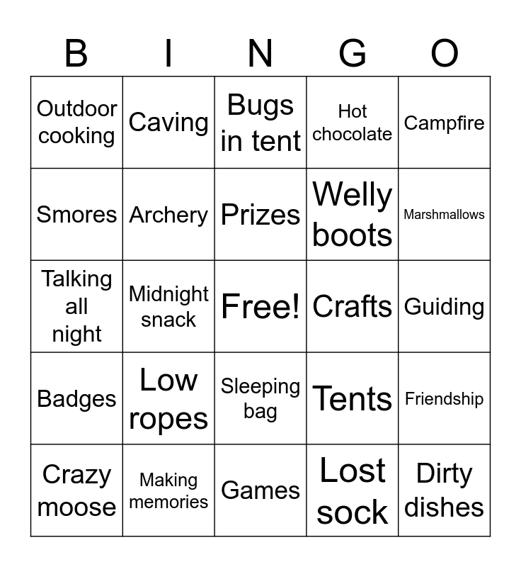 This bingo card has a free space and 24 words: Low ropes, Making memories, Prizes, Crazy moose, Campfire, Outdoor cooking, Smores, Caving, Crafts, Sleeping bag, Welly boots, Talking all night, Tents, Friendship, Archery, Lost sock, Guiding, Bugs in tent, Marshmallows, Midnight snack, Dirty dishes, Badges, Hot chocolate and Games.