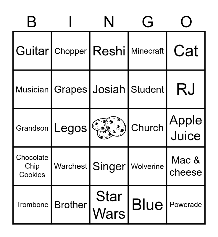 This bingo card has a free space and 24 words: Warchest, Brother, Josiah, Trombone, Cat, Guitar, Musician, Chopper, Church, Singer, Student, Grandson, Wolverine, Mac & cheese, Grapes, Blue, Apple Juice, Reshi, RJ, Legos, Powerade, Chocolate Chip Cookies, Minecraft and Star Wars.