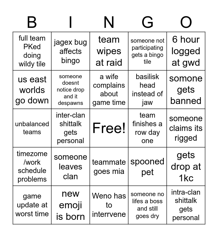 This bingo card has a free space and 24 words: someone leaves clan, new emoji is born, a wife complains about game time, game update at worst time, 6 hour logged at gwd, full team PKed doing wildy tile, us east worlds go down, jagex bug affects bingo, team finishes a row day one, teammate goes mia, basilisk head instead of jaw, unbalanced teams, spooned pet, gets drop at 1kc, someone doesnt notice drop and it despawns, someone no lifes a boss and still goes dry, someone claims its rigged, team wipes at raid, somone gets banned, inter-clan shittalk gets personal, intra-clan shittalk gets personal, timezome /work schedule problems, someone not participating gets a bingo tile and Weno has to interrvene.