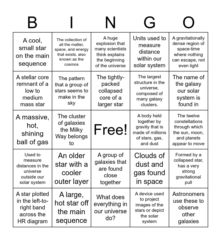This bingo card has a free space and 24 words: An older star with a cooler outer layer, A large, hot star off the main sequence, The tightly-packed collapsed core of a larger star, A star plotted in the left-to-right band across the HR diagram, A gravitationally dense region of space-time where nothing can escape, not even light, A cool, small star on the main sequence, A stellar core remnant of a low to medium mass star, The collection of all the matter, space, and energy that exists, also known as the cosmos, A body held together by gravity that is made of millions of stars, gas, and dust, A group of galaxies that are found close together, The largest structure in the universe, composed of many galaxy clusters., A massive, hot, shining ball of gas, Clouds of dust and gas found in space, Formed by a collapsed star, has a very strong gravitational pull, The pattern that a group of stars seems to make in the sky, A device used to project images of the stars or depict the solar system, The twelve constellations through which the sun, moon, and planets appear to move, A huge explosion that many scientists think explains the beginning of the universe, The name of the galaxy our solar system is found in, The cluster of galaxies the Milky Way belongs to, Astronomers use these to observe other galaxies, Used to measure distances in the universe outside our solar system, Units used to measure distance within our solar system and What does everything in our universe do?.