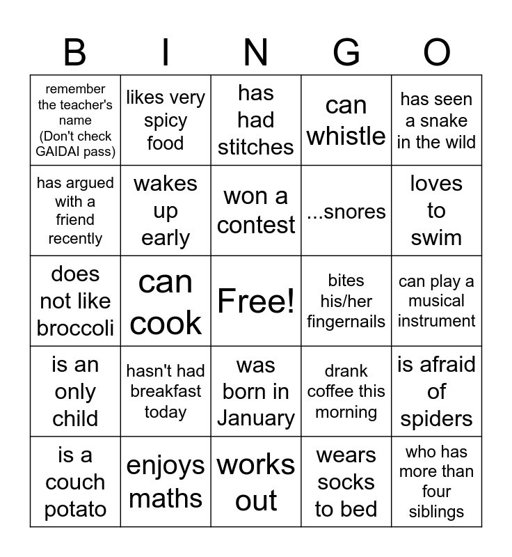 This bingo card has a free space and 24 words: hasn't had breakfast today, enjoys maths, won a contest, is a couch potato, has seen a snake in the wild, remember the teacher's name (Don't check GAIDAI pass), has argued with a friend recently, likes very spicy food, bites his/her fingernails, was born in January, ...snores, does not like broccoli, drank coffee this morning, is afraid of spiders, wakes up early, wears socks to bed, can play a musical instrument, has had stitches, loves to swim, can cook, who has more than four siblings, is an only child, can whistle and works out.
