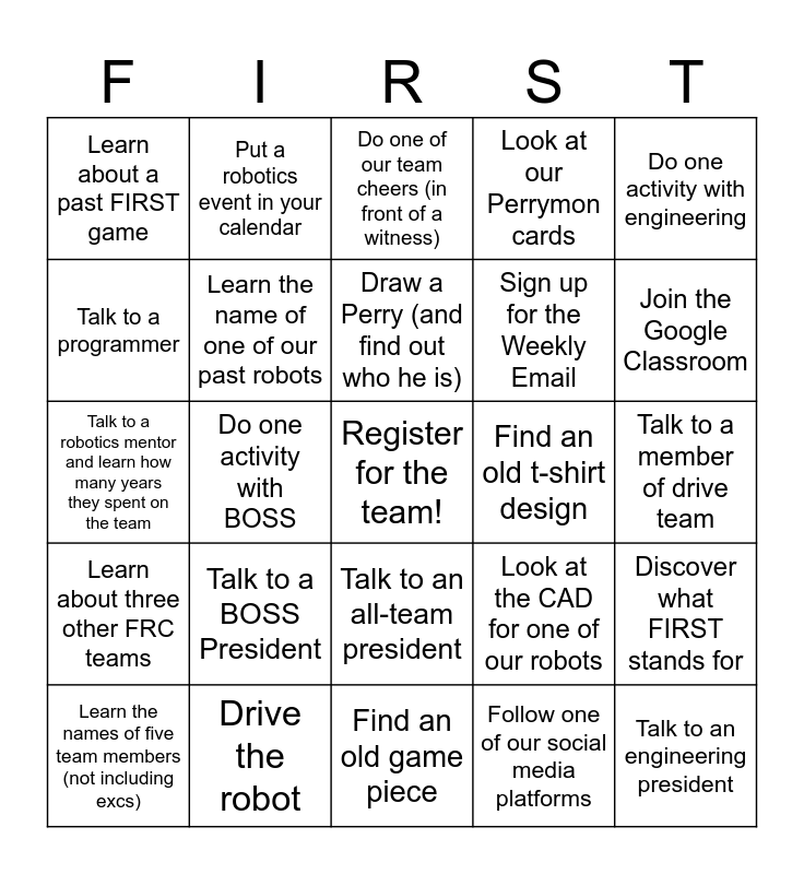 This bingo card has a free space and 24 words: Talk to a BOSS President, Drive the robot, Draw a Perry (and find out who he is), Learn the names of five team members (not including excs), Do one activity with engineering, Learn about a past FIRST game, Talk to a programmer, Put a robotics event in your calendar, Find an old t-shirt design, Talk to an all-team president, Sign up for the Weekly Email, Talk to a robotics mentor and learn how many years they spent on the team, Look at the CAD for one of our robots, Discover what FIRST stands for, Learn the name of one of our past robots, Follow one of our social media platforms, Talk to a member of drive team, Do one of our team cheers (in front of a witness), Join the Google Classroom, Do one activity with BOSS, Talk to an engineering president, Learn about three other FRC teams, Look at our Perrymon cards and Find an old game piece.