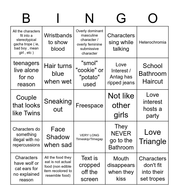 This bingo card has a free space and 24 words: Face Shadow when sad, All the food they eat is not actual food (non edible item recolored to resemble food), "smol" "cookie" or "potato" used, Characters have wolf or cat ears for no explained reason, Heterochromia, All the characters fit into a stereotypical gacha trope ( ie, bad boy , mean girl , etc ), teenagers live alone for no reason, Wristbands to show blood, Not like other girls, VERY LONG Timeskip/Timegap, Love Interest / Antag has ripped jeans, Couple that looks like Twins, They NEVER go to the Bathroom, Love Triangle, Hair turns blue when wet, Mouth disappears when they kiss, Love interest hosts a party, Overly dominant masculine character / overly feminine submissive character, School Bathroom Haircut, Sneaking out, Characters don't fit into their set tropes, Characters do something illegal with no repercussions, Characters sing while talking and Text is cropped off the screen.