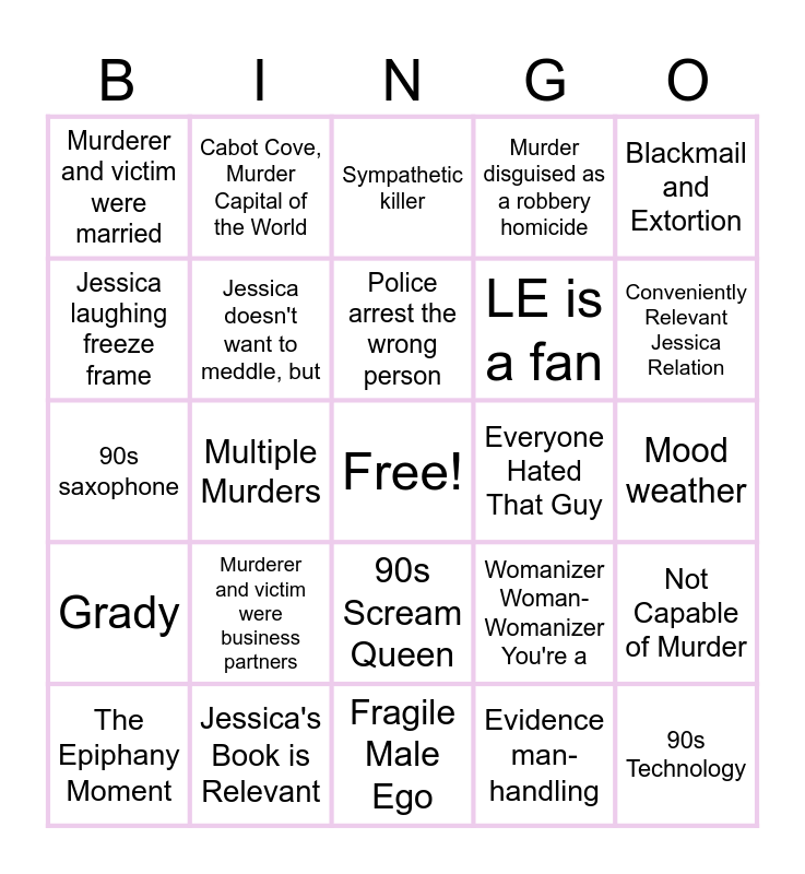 This bingo card has a free space and 47 words: Hey, It's That Guy, Jessica's Book is Relevant, 6 Degrees of Jessica Fletcher, Wealthy Friend, Conveniently Relevant Jessica Relation, Grady, Cabot Cove, Murder Capital of the World, LE Underestimates Jessica, LE is a fan, 90s Technology, Jessica laughing freeze frame, Jessica doesn't want to meddle, but, Evidence man-handling, Not Capable of Murder, Only the murderer could have known, Seth, Police arrest the wrong person, Womanizer Woman- Womanizer You're a, Murder and victim were related, Murderer and victim were married, Murderer and victim were business partners, Murder disguised as an accident or suicide, Murder disguised as a robbery homicide, Blackmail and Extortion, Someone is framed, Multiple Murders, 90s Scream Queen, Harry, Michael, or Dennis, Mood weather, 90s saxophone, Fabulous fashion, A scuffle, Jessica gets sassy, Jessica receives a phone call while out and about, Jessica needs a ride, Confronting the killer "alone", Fragile Male Ego, Poirot Reveal, Murder in the first five minutes, The Epiphany Moment, Someone flirts with Jessica, Sympathetic killer, Everyone Hated That Guy, Sheriff Tupper wants a snack, Tupper/Metzger, "I'm not so sure" and Adultery.