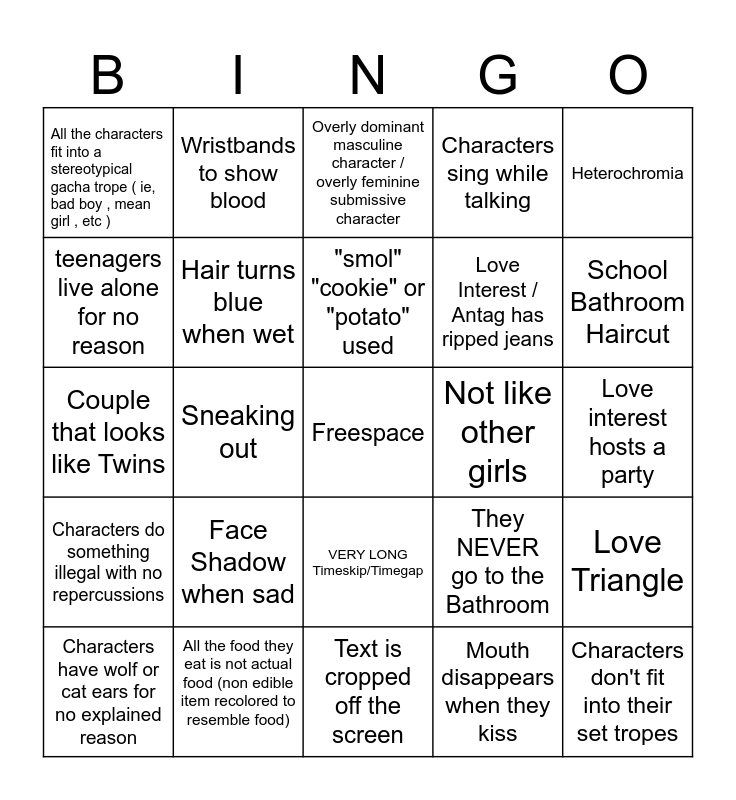 This bingo card has a free space and 24 words: Face Shadow when sad, All the food they eat is not actual food (non edible item recolored to resemble food), "smol" "cookie" or "potato" used, Characters have wolf or cat ears for no explained reason, Heterochromia, All the characters fit into a stereotypical gacha trope ( ie, bad boy , mean girl , etc ), teenagers live alone for no reason, Wristbands to show blood, Not like other girls, VERY LONG Timeskip/Timegap, Love Interest / Antag has ripped jeans, Couple that looks like Twins, They NEVER go to the Bathroom, Love Triangle, Hair turns blue when wet, Mouth disappears when they kiss, Love interest hosts a party, Overly dominant masculine character / overly feminine submissive character, School Bathroom Haircut, Sneaking out, Characters don't fit into their set tropes, Characters do something illegal with no repercussions, Characters sing while talking and Text is cropped off the screen.