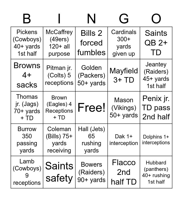 This bingo card has a free space and 152 words: Hurts Tush push TD, Daniels two TD pass (full game), Dak 1+ interception, Russel Wilson 225+ passing yards, Darnold passing TD 1st half, Mac jones TD 1st half, Murray 1 rush TD, Stafford 300 passing yards, Goff TD 2nd half, Love 250 passing yards, Williams rushing TD, Vikings QB interception 1st half, Mayfield 3+ TD, Young passing TD 2nd half, Penix jr. TD pass 2nd half, Saints QB 2+ TD, Tua 2+ TD, Jets QB 1+ rushing TD, Allen 300+ passing yards, Maye TD passing 1st half, Ward 2+ TD, Stroud TD pass 2nd half, Lawrence interception, Jones 225 passing yards, Jackson rushing and passing TDs, Rodgers 215 passing yards, Flacco 2nd half TD, Burrow 350 passing yards, Herbert 2+ TD, Nix TD 1st half, Mahomes 2 TD 1 interception, Smith 1 interception 1st half, Kenny walker (sea) 60+ yards, McCaffrey (49ers) 120+ all purpose, James Connor (Cards) rushing TD 1st half, Williams (rams) receiving TD, Barkley (eagles) 100+ all purpose + TD, Commanders ANY receiving running back TD, Croskey-Merritt 40+ yards, Tracy (giants) fumble, Williams (cowboys) 30+ yards, Kamara (saints) ANY TD 1st half, Hubbard (panthers) 40+ rushing 1st half, Irving (buccs) 3+ receptions, Robinson (falcons) 50+ yards + TD ANY in 1st half, Jacobs (packers) 70+ rush yards + TD, Swift (bears) 35+ rushing yards 1st half, Gibbs (lions) 75+ receiving yards + TD, Mason (Vikings) 50+ yards, Cook (Bills) 25+ yards 1st half, Achane (Dolphins) 2 TD, Stevenson\Henderson (Pats) 45 yards, Hall (Jets) 65 rushing yards, Dobbins (Broncos) 75+ all purpose yards, Any RB (Chiefs) 2nd half TD, Jeantey (Raiders) 45+ yards 1st half, Hampton (Chargers) 1+ receiving TD, Henry (Ravens) 100+ rushing yards, Brown (Bengals) TD 2nd half, Ford (Browns) 65+ rushing yards, Warren (Steelers) 50+ yards +TD, Chubb (Texans) 80+ rushing yards, Taylor (Colts) 90+ yards + TD, Etienne (Jags) 100 all purpose yards, Pollard (Titans) TD 1st half, Coleman (Bills) 75+ yards receiving, Hill (Dolphins) 100+ yards, Waddle (Dolphins) 1st half TD, Diggs (Pats) 50+ 2nd half, Wilson (Jets) 80+ yards+ TD, Sutton (Broncos) 6 receptions, Kelce (Chiefs) 2nd half TD, Brown (Chiefs) 50+ yards, Bowers (Raiders) 90+ yards, Myers (Raiders) 1+ TD, McConkey (Chargers) 7 receptions, Allen (Chargers) TD 1st half, Flowers (Ravens) 35+ yards TD, Chase (Bengals) 100+ yards + TD, Higgins (Bengals) 75+ yards, Jeudy (Browns) 1+ TD, Metcalf (Steelers) 5 receptions, Collins (Texans) 5 receptions + 80 yards, Pitman jr. (Colts) 5 receptions, Thomas jr. (Jags) 70+ yards + TD, Hunter (Jags) 1+ reception + tackle, Ridley (Titans) 1st half TD, Lamb (Cowboys) 9 receptions, Pickens (Cowboys) 40+ yards 1st half, Nabers (Giants) 10 targets, Brown (Eagles) 4 Receptions + TD, Smith (Eagles) 70+ yards, Mclaurin (Commanders) 2nd half TD, Samuel (Commanders) 3+ carries, Harrison jr. (Cards) 6 targets, Nacua (Rams) 90+ yards, Adams (Rams) 6 receptions, Jennings (49ers) 50+ yards + TD, Persseal (49ers) 70+ yards, JSM (Seahawks) 75+ yards, Cupp (Seahawks) 1+ TD, Moore (Bears) 70+ yards, St. Brown (Lions) 100+ yards, Williams (Lions) 1+ TD, Golden (Packers) 50+ yards, Kraft (Packers) 3 receptions, Jefferson (Vikings) 100+ yards + TD, London (Falcons) 70+ yards + TD, McMillan (Panthers) 7 targets, Olave (Saints) 60+ yards, Evans (Buccs) 1+ TD 2nd half, Bills 2 forced fumbles, Dolphins 1+ interceptions, Patriots 3+ sacks, Jets 20+ points given up, Ravens 2+ interceptions, Bengals 30+ points given up, Browns 4+ sacks, Steelers 2+ turnovers ANY, Texans 2nd half interception, Colts give up less than 250 yards, Jaguars 1+ sack 1st half, Titans 1+ interception, Broncos fumble recovery 2nd half, Chiefs 3+ sacks, Raiders 350+ given up, Chargers 2+ turnovers ANY, Cowboys NO Turnovers, Giants 25+ points given up, Eagles 5+ sacks, Commanders fumble recovery 2nd half, Bears 1+ interception + forced fumble, Lions 4+ sacks, Packers 1+ interception + 3+ sacks, Vikings 300+ yards given up, Falcons 250+ given up receiving yards, Panthers 100+ rushing yards given up, Saints safety, Buccs 2+ turnovers, Cardinals 300+ yards given up, Rams 2+ forced fumbles, 49ers interception 2nd half, Seahawks 1+ fumble recovery, Butker 2 40+ yard field goals, Dicker 50+ yard field goal, Bates 50+ yard field goal, McManus 40+ yard field goal, Boswell 2 fields goals, Aubrey missed extra point, McLaughlin 3+ field goals, Elliot missed field goalt and Bass field goal 4th quarter.