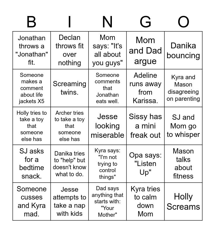 This bingo card has a free space and 30 words: Jesse attempts to take a nap with kids, Alease saying: No 10X, Archer tries to take a toy that someone else has, Mom says: "You all bugging me", Jonathan throws a "Jonathan" fit., Mom says: "It's all about you guys", Screaming twins., Kyra says: "I'm not trying to control things", Sissy has a mini freak out, Dad says anything that starts with: "Your Mother", SJ and Mom go to whisper, Holly Screams, Kyra tries to calm down Mom, Mom degrades her appearance, Kyra and Mason disagreeing on parenting, Karissa does angry flappy arm, Opa says: "Listen Up", SJ asks for a bedtime snack., Danika tries to "help" but doesn't know what to do., Danika bouncing, Holly tries to take a toy that someone else has, Archer says: "Daddy", Declan throws fit over nothing, Adeline runs away from Karissa., Someone makes a comment about life jackets X5, Mom and Dad argue, Mason talks about fitness, Someone cusses and Kyra mad., Someone comments that Jonathan eats well. and Alease lets Styles pick her up..