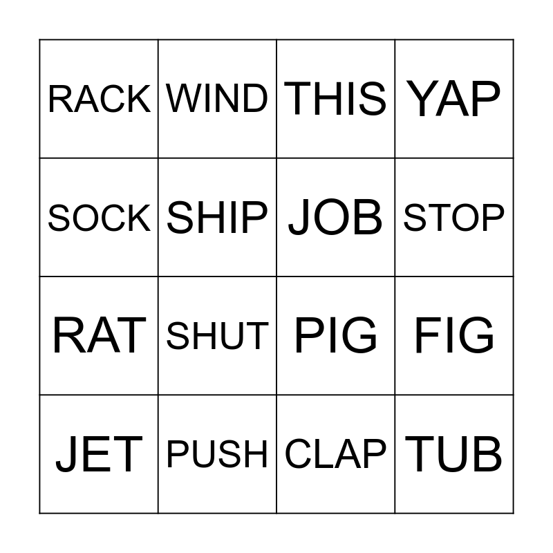 This bingo card has 16 words: JET, PUSH, THIS, YAP, SOCK, WIND, PIG, FIG, RACK, SHIP, CLAP, STOP, RAT, SHUT, JOB and TUB.