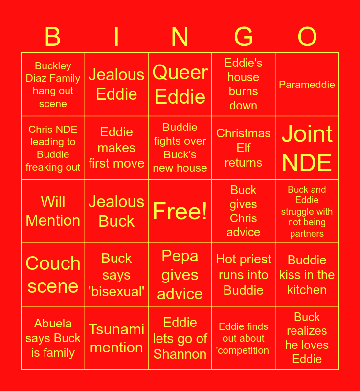 This bingo card has a free space and 24 words: Buck says 'bisexual', Tsunami mention, Buddie fights over Buck's new house, Abuela says Buck is family, Parameddie, Buckley Diaz Family hang out scene, Chris NDE leading to Buddie freaking out, Jealous Eddie, Buck gives Chris advice, Pepa gives advice, Christmas Elf returns, Will Mention, Hot priest runs into Buddie, Buddie kiss in the kitchen, Eddie makes first move, Eddie finds out about 'competition', Buck and Eddie struggle with not being partners, Queer Eddie, Joint NDE, Jealous Buck, Buck realizes he loves Eddie, Couch scene, Eddie's house burns down and Eddie lets go of Shannon.