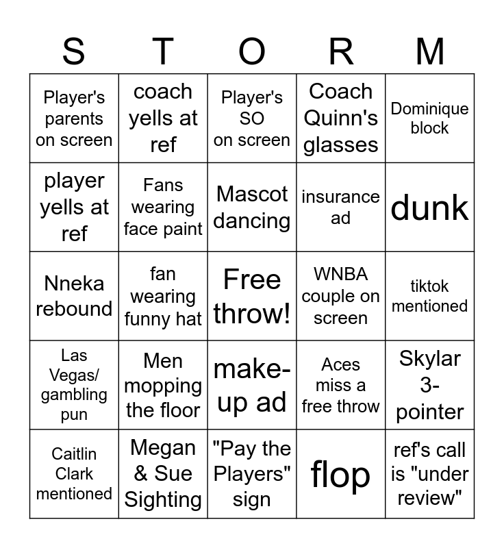 This bingo card has a free space and 24 words: Men mopping the floor, Megan & Sue Sighting, Mascot dancing, Caitlin Clark mentioned, Dominique block, Player's parents on screen, player yells at ref, coach yells at ref, WNBA couple on screen, make-up ad, insurance ad, Nneka rebound, Aces miss a free throw, Skylar 3-pointer, Fans wearing face paint, flop, tiktok mentioned, Player's SO on screen, dunk, fan wearing funny hat, ref's call is "under review", Las Vegas/ gambling pun, Coach Quinn's glasses and "Pay the Players" sign.