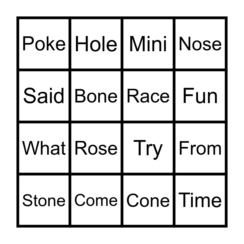 This bingo card has 16 words: Come, From, Mini, Poke, What, Hole, Try, Cone, Said, Bone, Stone, Nose, Rose, Fun, Race and Time.
