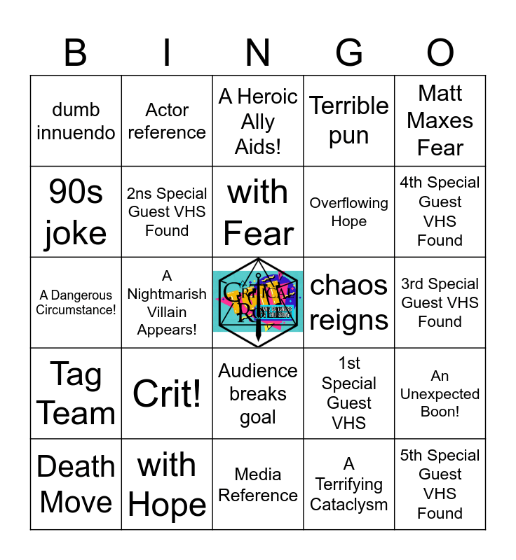 This bingo card has a free space and 24 words: Crit!, with Hope, with Fear, Death Move, Matt Maxes Fear, dumb innuendo, 90s joke, Actor reference, chaos reigns, Audience breaks goal, Overflowing Hope, A Dangerous Circumstance!, 1st Special Guest VHS, An Unexpected Boon!, 2ns Special Guest VHS Found, A Terrifying Cataclysm, 3rd Special Guest VHS Found, A Heroic Ally Aids!, 4th Special Guest VHS Found, A Nightmarish Villain Appears!, 5th Special Guest VHS Found, Tag Team, Terrible pun and Media Reference.