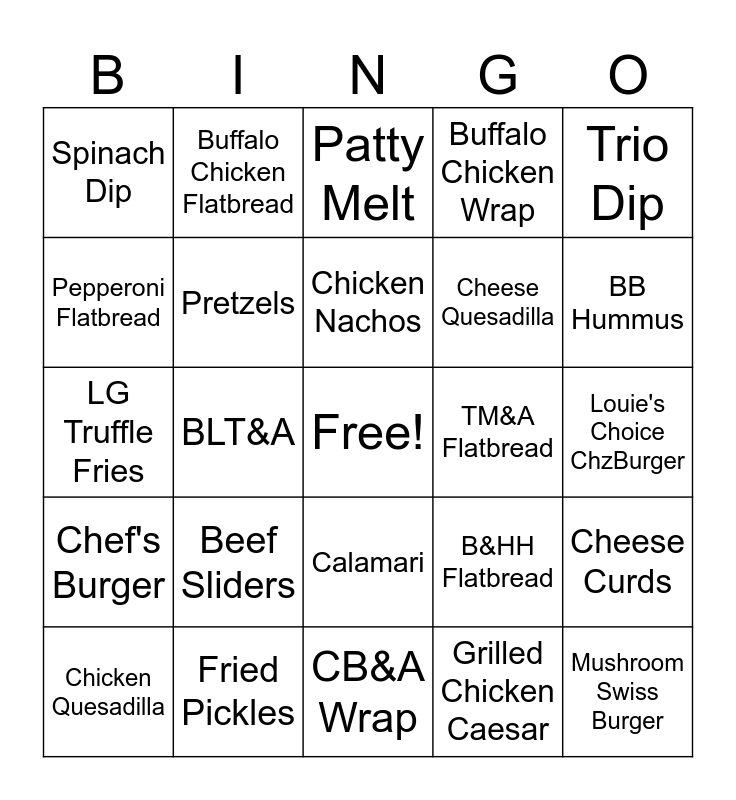 This bingo card has a free space and 24 words: Beef Sliders, Fried Pickles, Chicken Nachos, Chicken Quesadilla, Trio Dip, Spinach Dip, Pepperoni Flatbread, Buffalo Chicken Flatbread, TM&A Flatbread, Calamari, Cheese Quesadilla, LG Truffle Fries, B&HH Flatbread, Cheese Curds, Pretzels, Grilled Chicken Caesar, Louie's Choice ChzBurger, Patty Melt, BB Hummus, BLT&A, Mushroom Swiss Burger, Chef's Burger, Buffalo Chicken Wrap and CB&A Wrap.