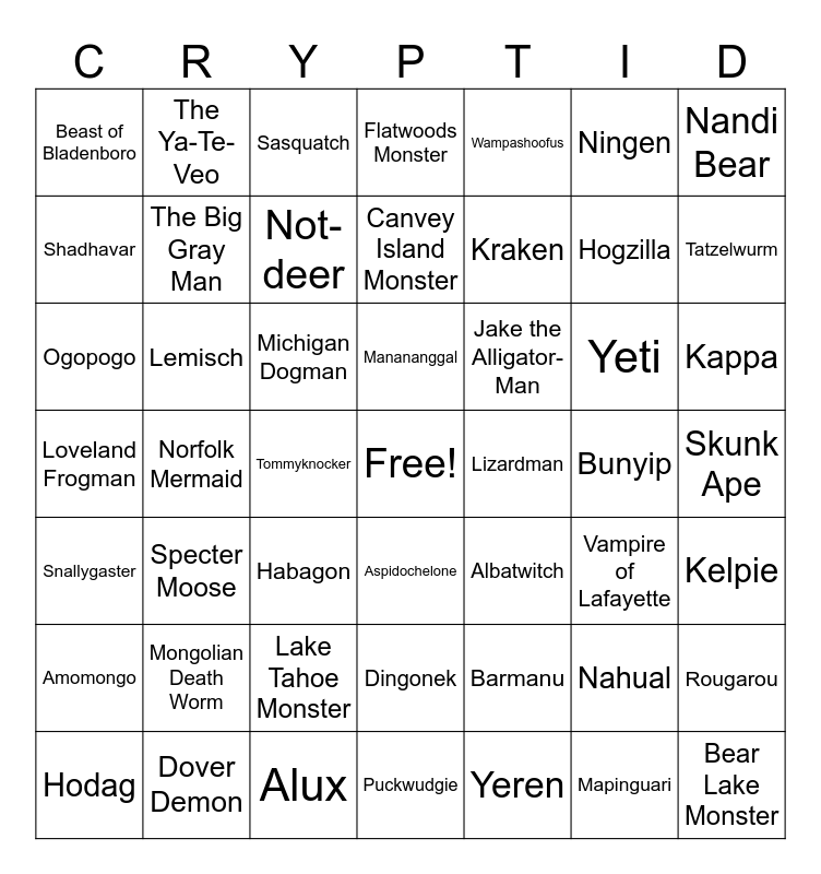 This bingo card has a free space and 104 words: Jersey Devil, Mothman, Sasquatch, Fresno Nightcrawler, Wendigo, Jackalope, Chupacabra, Lake Champlain Monster, Lake Tahoe Monster, Silver Lake Serpent, Walgren Lake Monster, Alkali Lake Monster, Bear Lake Monster, Bloop, Cactus Cat, Michigan Dogman, Flatwoods Monster, Wampus Cat, Enfield Horror, Ozark Howler, Hodag, Skinwalker, Tommyknocker, Slide Rock Bolter, Thunderbird, Yeti, Tatzelwurm, Beast of Bladenboro, Ahool, Beast of Busco, Canvey Island Monster, Lizardman, Owlbear, Rougarou, Snallygaster, Dover Demon, Alux, La Llorona, Kraken, Bunyip, Dobhar-chú, Loveland Frogman, Mongolian Death Worm, Not-deer, Snarly Yow, Wampashoofus, Glawackus, Skunk Ape, Moon-Eyed People, Norfolk Mermaid, Minnesota Iceman, Puckwudgie, Albatwitch, Pope Lick Monster, Ock-ock, Van Meter Visitor, Runalong, Wolpertinger, Sqwonk, Jake the Alligator-Man, Hogzilla, Grootslang, Hopkinsville Goblin, Jenglot, White Bluff Screamer, Dingonek, Yowie, Ningen, Kappa, Ogopogo, Lemisch, The Snowman Owl, Ropen, La Lechuza, Mapinguari, Alamasty, Amomongo, The Big Gray Man, Habagon, Mokele-mbembe, Beast of Exmoor, Leviathan, Nandi Bear, Chuchunya, The Ya-Te-Veo, Ebu Gogo, Aspidochelone, Augerino, Vampire of Lafayette, Kelpie, Nuckelavee, The Black Shuck, Naga, Manananggal, Barmanu, Tsuchinoko, Al-miraj, Shadhavar, Specter Moose, Menehune, Penanggalan, Yeren, Nahual and Duende.