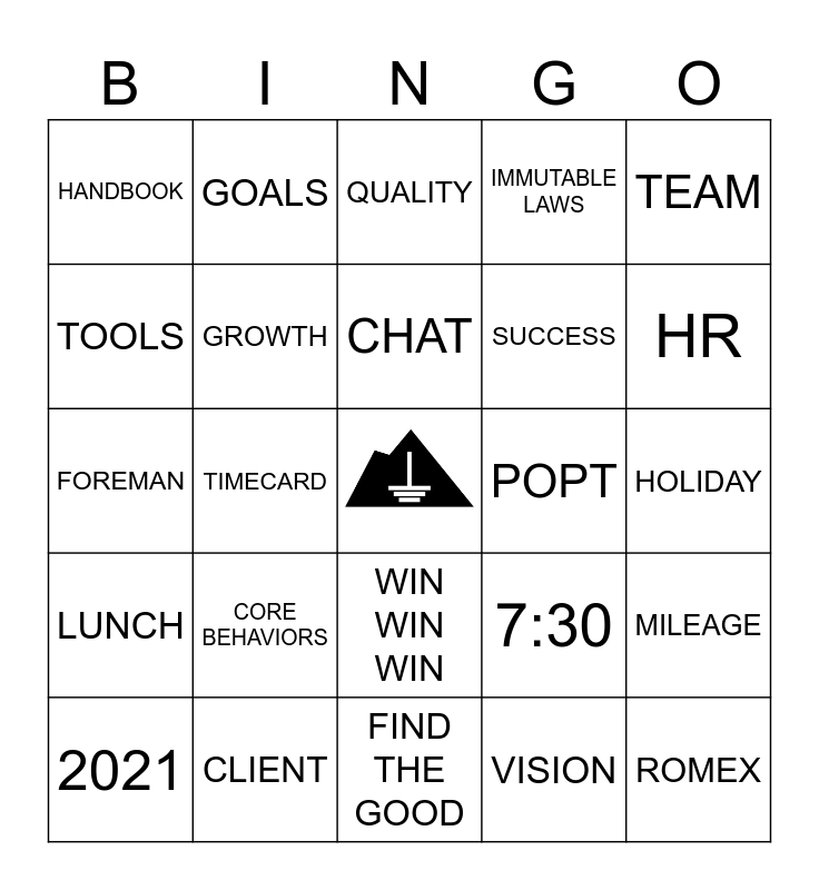 This bingo card has a free space and 44 words: WIRENUT, ROMEX, THNN, 2021, MISSION, VISION, QUALITY, ELECTRIC, TEAM, CLIENT, IMMUTABLE LAWS, POPT, WIN WIN WIN, CORE BEHAVIORS, RESPECT, FIND THE GOOD, OWN IT, FOREMAN, GUSTO, HR, GOALS, 1<>1s, PROFIT, HANDBOOK, RECRUIT, HOLIDAY, PTO, REQUEST LEAVE, 7:30, LUNCH, BREAK, MILEAGE, UNIFORMS, JOBBER, TIMECARD, HOURS, EXPENSES, GROUPME, CHAT, TOOLS, SUCCESS, PREPARE, GROWTH and CULTURE.