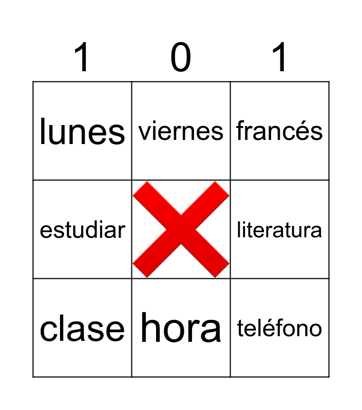 This bingo card has a free space and 8 words: literatura, francés, viernes, clase, lunes, teléfono, estudiar and hora.