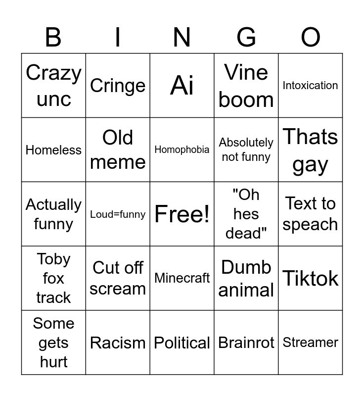 This bingo card has a free space and 24 words: Cut off scream, Racism, Homophobia, Some gets hurt, Intoxication, Crazy unc, Homeless, Cringe, "Oh hes dead", Minecraft, Absolutely not funny, Actually funny, Dumb animal, Tiktok, Old meme, Brainrot, Text to speach, Ai, Thats gay, Loud=funny, Streamer, Toby fox track, Vine boom and Political.