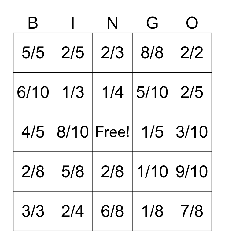 This bingo card has a free space and 34 words: 1/2, 1/8, 2/10, 4/4, 2/8, 1/3, 2/2, 3/3, 2/5, 3/8, 1/4, 2/3, 3/5, 4/8, 1/5, 2/5, 2/4, 4/5, 5/8, 1/10, 2/8, 3/4, 5/5, 3/10, 6/8, 7/8, 8/8, 4/10, 5/10, 6/10, 7/10, 8/10, 9/10 and 10/10.
