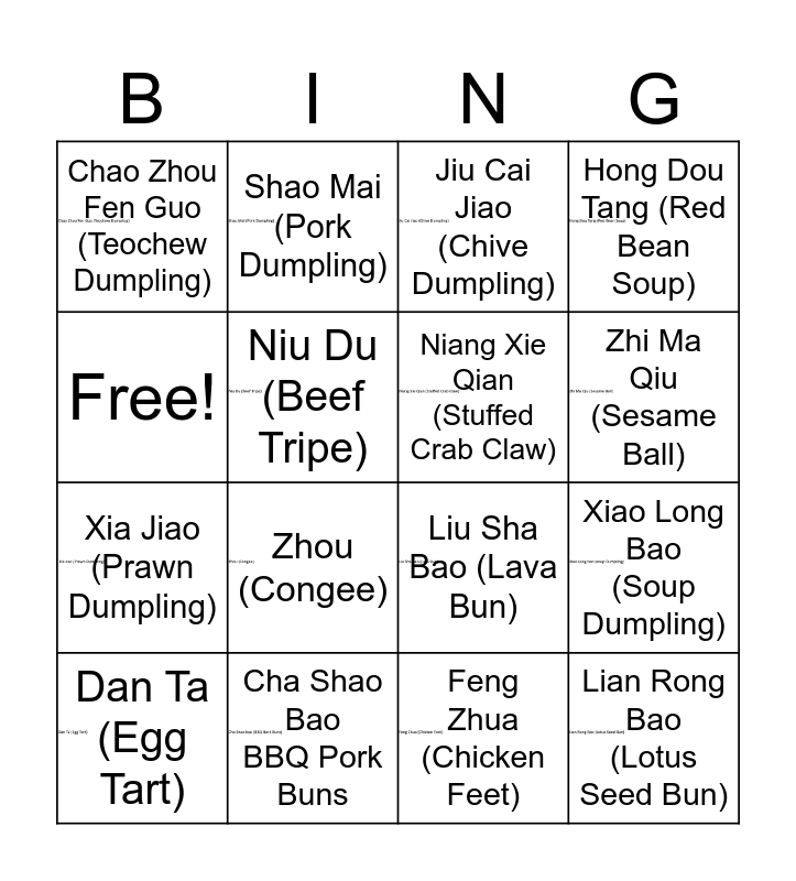This bingo card has 15 images and 16 words: Cha Shao Bao BBQ Pork Buns, Xiao Long Bao (Soup Dumpling), Jiu Cai Jiao (Chive Dumpling), Chao Zhou Fen Guo (Teochew Dumpling), Xia Jiao (Prawn Dumpling), Shao Mai (Pork Dumpling), Liu Sha Bao (Lava Bun), Feng Zhua (Chicken Feet), Free!, Niu Du (Beef Tripe), Dan Ta (Egg Tart), Hong Dou Tang (Red Bean Soup), Zhou (Congee), Zhi Ma Qiu (Sesame Ball), Niang Xie Qian (Stuffed Crab Claw) and Lian Rong Bao (Lotus Seed Bun).