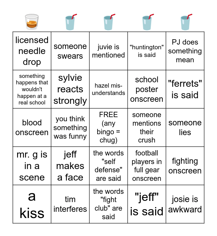 This bingo card has a free space and 24 words: a kiss, jeff makes a face, hazel mis-understands, "jeff" is said, PJ does something mean, licensed needle drop, someone swears, juvie is mentioned, someone mentions their crush, someone lies, blood onscreen, sylvie reacts strongly, football players in full gear onscreen, fighting onscreen, something happens that wouldn't happen at a real school, tim interferes, the words "fight club" are said, "huntington" is said, "ferrets" is said, mr. g is in a scene, you think something was funny, the words "self defense" are said, school poster onscreen and josie is awkward.