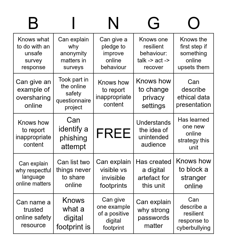 This bingo card has a free space and 24 words: Can list two things never to share online, Knows what a digital footprint is, Knows how to report inappropriate content, Can name a trusted online safety resource, Knows the first step if something online upsets them, Knows what to do with an unsafe survey response, Can give an example of oversharing online, Can explain why anonymity matters in surveys, Understands the idea of unintended audience, Can explain visible vs invisible footprints, Knows how to change privacy settings, Knows how to report inappropriate content, Has created a digital artefact for this unit, Knows how to block a stranger online, Took part in the online safety questionnaire project, Can explain why strong passwords matter, Has learned one new online strategy this unit, Can give a pledge to improve online behaviour, Can describe ethical data presentation, Can identify a phishing attempt, Can describe a resilient response to cyberbullying, Can explain why respectful language online matters, Knows one resilient behaviour: talk -> act -> recover and Can give one example of a positive digital footprint.