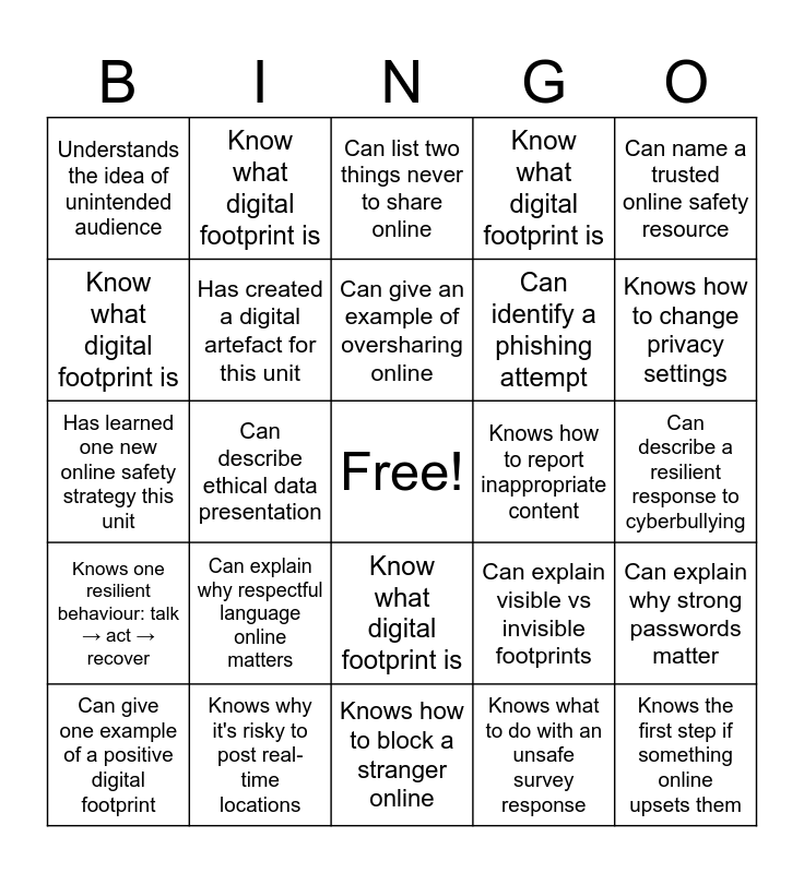 This bingo card has a free space and 29 words: Know what digital footprint is, Knows why it's risky to post real-time locations, Can list two things never to share online, Can explain why anonymity matters in surveys, Can name a trusted online safety resource, Understands the idea of unintended audience, Has created a digital artefact for this unit, Can give an example of oversharing online, Knows how to report inappropriate content, Can explain why strong passwords matter, Can give one example of a positive digital footprint, Can describe ethical data presentation, Knows what to do with an unsafe survey response, Knows the first step if something online upsets them, Has learned one new online safety strategy this unit, Can give a pledge to improve online behaviour, Knows how to block a stranger online, Can explain visible vs invisible footprints, Knows how to change privacy settings, Knows one resilient behaviour: talk → act → recover, Can explain why respectful language online matters, Took part in the Online Safety Questionnaire project, Can identify a phishing attempt, Can describe a resilient response to cyberbullying, Know what digital footprint is, Know what digital footprint is, Know what digital footprint is, Know what digital footprint is and Know what digital footprint is.