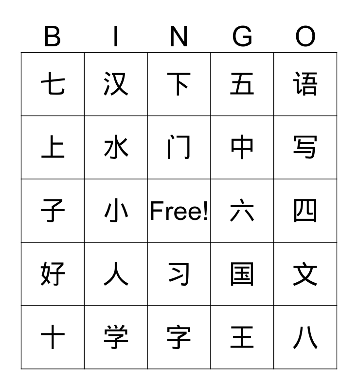 This bingo card has a free space and 24 words: 人, 学, 门, 十, 语, 七, 上, 汉, 六, 习, 中, 子, 国, 文, 水, 王, 四, 下, 写, 小, 八, 好, 五 and 字.