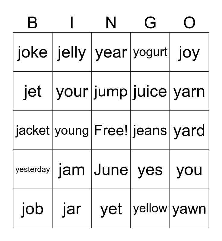 This bingo card has a free space and 24 words: jam, jar, jump, job, joy, joke, jet, jelly, jeans, June, juice, jacket, yes, you, your, yellow, yard, year, yarn, young, yawn, yesterday, yogurt and yet.