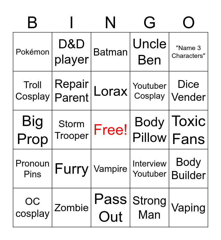 This bingo card has a free space and 24 words: Furry, Zombie, Lorax, OC cosplay, "Name 3 Characters", Pokémon, Troll Cosplay, D&D player, Body Pillow, Vampire, Youtuber Cosplay, Big Prop, Interview Youtuber, Body Builder, Repair Parent, Strong Man, Toxic Fans, Batman, Dice Vender, Storm Trooper, Vaping, Pronoun Pins, Uncle Ben and Pass Out.