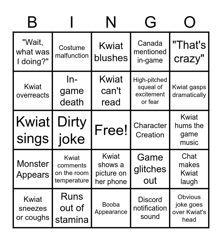This bingo card has a free space and 76 words: VIP chatter appearance, Kwiat laughs until she cries, Kwiat blushes, In-game jumpscare, Sound alert jump-scare redeem, Cat: Milo appearance, Cat: Peachie appearance, Cat: Stinkie appearance, Cat: Banda appearance, Stream crashes, Streamer forgets to change scene, Streamer is muted, Kwiat can't read, Kwiat overreacts, In-game cat appears, Dirty joke, Question about keytar, Obvious joke goes over Kwiat's head, "Alright", "That's crazy", "Follow the Call", Kwiat sings, In-game death, Costume malfunction, Canada mentioned in-game, Kwiat gets angry, "I can't do this", "What do you mean?”, Kwiat threatens to end stream, Backseating in chat, Kwiat mispronounces a word, Raid, First-time chatter says hello, Game glitches out, Kwiat gasps dramatically, High-pitched squeal of excitement or fear, Kwiat talks to herself to figure something out, Kwiat apologizes to an in-game NPC, Kwiat hums the game music, Discord notification sound, A hype train starts, Steam Achievement, Kwiat does a victory dance, Kwiat is Quiet, Another streamer mentioned, Kwiat stretches, Kwiat sneezes or coughs, "Wait, what was I doing?", Kwiat gives up and looks up a guide online, Kwiat hears a noise off-stream, Joke fails, Kwiat shows a picture on her phone, Kwiat gets a snack, Potty break, Mouse/keyboard stops working, Kwiat accidentally clicks out of the game window, Kwiat eats a snack on stream, Stream title or category is changed live, Kwiat laughs at her own joke, Kwiat's phone rings, Kwiat comments on the room temperature, "Don't worry about it", 69, Kwiat reacts to something cute in game, Kwiat reads same chat comment twice, Kwiat writes something down, Character Creation, Kwiat skips instructions/dialogue, Kwiat gets too scared to move forward, Halloween Candy, Chat makes Kwiat laugh, Monster Appears, Runs out of stamina, Drops Weapon, Booba Appearance and Kwiat flirts with NPC.