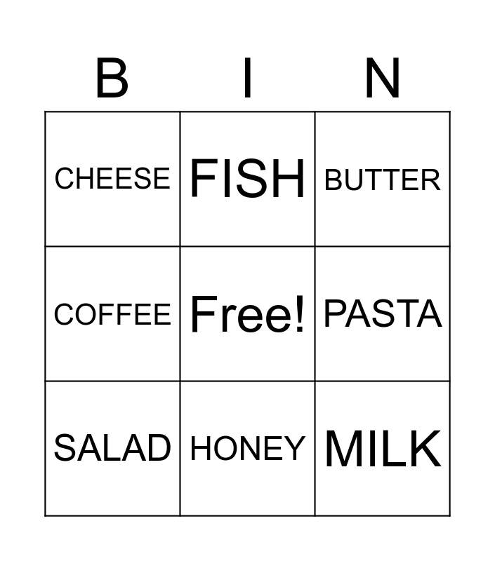 This bingo card has a free space and 18 words: APPLE, BREAD, BUTTER, CHEESE, CHIPS, COFFEE, CUPCAKE, FISH, HONEY, LEMONADE, MARMALADE, MILK, OLIVES, PASTA, SALAD, SANDWICH, TEA and YOGHURT.