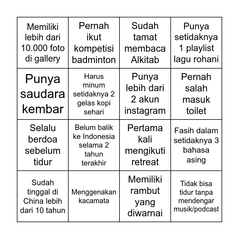This bingo card has 16 words: Menggenakan kacamata, Fasih dalam setidaknya 3 bahasa asing, Sudah tamat membaca Alkitab, Memiliki lebih dari 10.000 foto di gallery, Selalu berdoa sebelum tidur, Pernah ikut kompetisi badminton, Pertama kali mengikuti retreat, Memiliki rambut yang diwarnai, Punya saudara kembar, Harus minum setidaknya 2 gelas kopi sehari, Sudah tinggal di China lebih dari 10 tahun, Punya setidaknya 1 playlist lagu rohani, Belum balik ke Indonesia selama 2 tahun terakhir, Pernah salah masuk toilet, Punya lebih dari 2 akun instagram and Tidak bisa tidur tanpa mendengar musik/podcast.