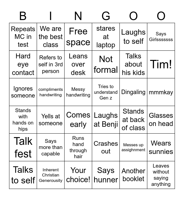 This bingo card has 39 words: Inherent Christian Generousity, Talks to self, Yasmin, Hard eye contact, Comes early, mmmkay, Refers to self in 3rd person, Leaves without saying anything, Laughs to self, Tries to understand Gen z, Tim!, stares at laptop, Ignores someone, Messy handwriting, compliments handwriting, Dingaling, Messes up assighnment, Repeats MC in test, Your choice!, Stands with hands on hips, Says Girlsssssss, Stands at back of class, Leans over desk, Not formal, Says hunner, Runs hand through hair, Talk fest, Another booklet, Says more than capable, We are the best class, Sighs dramatically, Wears sunnies, Free space, Laughs at Benji, Glasses on head, Crashes out, Yells at someone, Talks about his kids and Cant use technology.