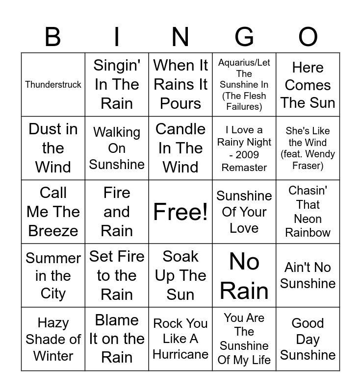 This bingo card has a free space and 50 words: Fool in the Rain, Good Day Sunshine, Heat Wave, Rock You Like A Hurricane, Set Fire to the Rain, Raindrops Keep Fallin' On My Head, Singin' In The Rain, It's Raining Men, Dust in the Wind, Sunshine Superman, Walking On Sunshine, Aquarius/Let The Sunshine In (The Flesh Failures), Ain't No Sunshine, No Rain, Cruel Summer, Have You Ever Seen The Rain, Candle In The Wind, Sunshine Of Your Love, Steal My Sunshine, Here Comes The Sun, Fire and Rain, You Are The Sunshine Of My Life, Thunderstruck, I Love a Rainy Night - 2009 Remaster, Against The Wind, Save It For A Rainy Day, She's Like the Wind (feat. Wendy Fraser), Ride Like the Wind, When It Rains It Pours, Soak Up The Sun, Snow (Hey Oh), Snowbird, Foggy Mountain Breakdown, Let It Snow! Let It Snow! Let It Snow!, Blame It on the Rain, Blue Eyes Crying In the Rain, Rain On The Scarecrow, I Wish It Would Rain, Searchin' for a Rainbow, Chasin' That Neon Rainbow, Like the Rain, Seminole Wind, I'm No Stranger to the Rain, Summer Breeze, Hazy Shade of Winter, Call Me The Breeze, Windy, Hot In Herre, Summer in the City and Blowin' in the Wind.