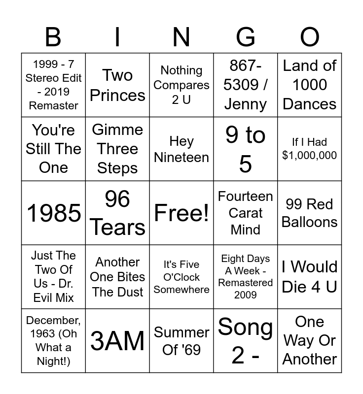This bingo card has a free space and 71 words: Song, Two Princes, Mambo No. 5 (a Little Bit of...), Edge of Seventeen - 2016 Remaster, Summer Of '69, I'm Gonna Be (500 Miles), 867-5309 / Jenny, 25 or 6 to 4 - 2002 Remaster, 9 to 5, 50 Ways to Leave Your Lover, December, 1963 (Oh What a Night!), One Week, If I Had $1,000,000, 1999 - 7 Stereo Edit - 2019 Remaster, Second Hand News - 2004 Remaster, 1985, Eight Days A Week - Remastered 2009, Land of 1000 Dances, Love Potion No. 9, 99 Red Balloons, Another One Bites The Dust, One Way Or Another, I Would Die 4 U, Knock Three Times, When I'm Sixty Four, One More Last Chance, 1, 2 Step (feat. Missy Elliott), One Step Closer, One, Two Out of Three Ain't Bad, 3AM, 1979 - Remastered 2012, Seven Nation Army, Seven Bridges Road, Song 2 -, 100 Years, ...Baby One More Time, I Got 5 On It, You're Still The One, Two Black Cadillacs, It's Five O'Clock Somewhere, Three Little Birds, Just The Two Of Us - Dr. Evil Mix, Two Dozen Roses, One of These Nights, One Bourbon, One Scotch, One Beer, One Last Breath, Gimme Three Steps, Three Times A Lady, Six Days On The Road, Seventeen, I'm Eighteen, Fourteen Carat Mind, Fifteen Beers, You're Sixteen (You’re Beautiful And You’re Mine), Sixteen Tons, Hey Nineteen, 22 (Taylor's Version), 24 Hours at a Time, Twenty Five Miles, 30 Days In The Hole, I Can't Drive 55, 96 Tears, A Thousand Miles, 2 Legit 2 Quit, 24K Magic, Nothing Compares 2 U, 18 and Life, 40oz. To Freedom, Sk8er Boi and I Second That Emotion.