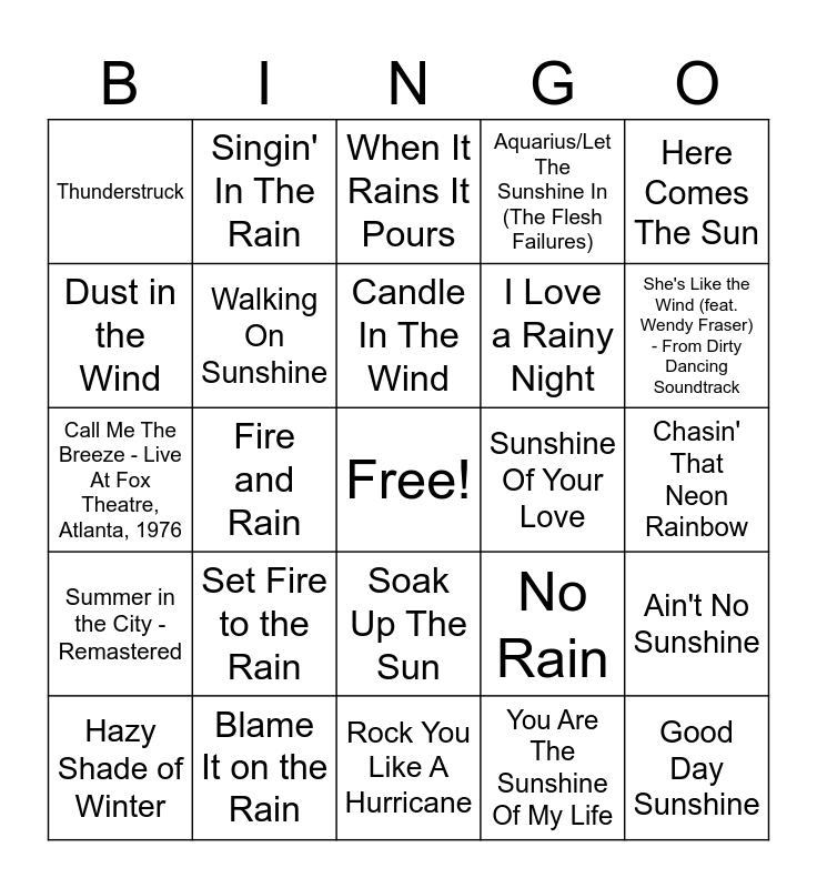 This bingo card has a free space and 50 words: Fool in the Rain, Good Day Sunshine, Heat Wave, Rock You Like A Hurricane, Set Fire to the Rain, Raindrops Keep Fallin' On My Head, Singin' In The Rain, It's Raining Men, Dust in the Wind, Sunshine Superman, Walking On Sunshine, Aquarius/Let The Sunshine In (The Flesh Failures), Ain't No Sunshine, No Rain, Cruel Summer, Have You Ever Seen The Rain, Candle In The Wind, Sunshine Of Your Love, Steal My Sunshine, Here Comes The Sun, Fire and Rain, You Are The Sunshine Of My Life, Thunderstruck, I Love a Rainy Night, Against The Wind, Save It For A Rainy Day, She's Like the Wind (feat. Wendy Fraser) - From Dirty Dancing Soundtrack, Ride Like the Wind, When It Rains It Pours, Soak Up The Sun, Snow (Hey Oh), Snowbird, Foggy Mountain Breakdown, Let It Snow! Let It Snow! Let It Snow!, Blame It on the Rain, Blue Eyes Crying In the Rain, Rain On The Scarecrow, I Wish It Would Rain, Searchin' for a Rainbow, Chasin' That Neon Rainbow, Like the Rain, Seminole Wind, I'm No Stranger to the Rain, Summer Breeze, Hazy Shade of Winter, Call Me The Breeze - Live At Fox Theatre, Atlanta, 1976, Windy - Remastered Version, Hot In Herre, Summer in the City - Remastered and Blowin' in the Wind.