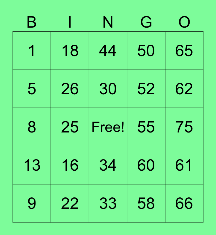 This bingo card has a free space and 24 words: 9, 16, 30, 58, 65, 1, 18, 44, 55, 75, 8, 26, 60, 61, 5, 22, 33, 50, 62, 13, 25, 34, 52 and 66.