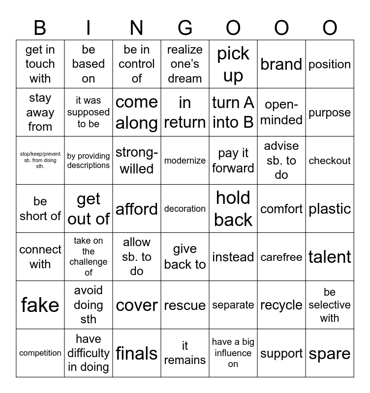 This bingo card has 72 words: be unaware of, be based on, turn A into B, talent, be unable to do, star, realize one’s dream, finals, it was supposed to be, normal, checkout, spare, come along, get in touch with, be thankful ___sb. ___sth., in return, pay it forward, pick up, have a big influence on, stop/keep/prevent sb. from doing sth., strong-willed, open-minded, advise sb. to do, plastic, allow sb. to do, recycle, cover, separate, give back to, have difficulty in doing, be short of, support, money-saving, in advance, afford, carefree, favorable, doubtful, brand, take on the challenge of, modernize, decoration, competition, by giving examples, by making comparisons, by providing descriptions, connect with, be selective with, limited, instead, fake, negative, avoid doing sth, purpose, hold back, encouraging, be in control of, stay away from, worn out, impact, other than, rather than, comfort, get out of, happen to be, rescue, position, it remains, appear to, as if, groceries and shape.