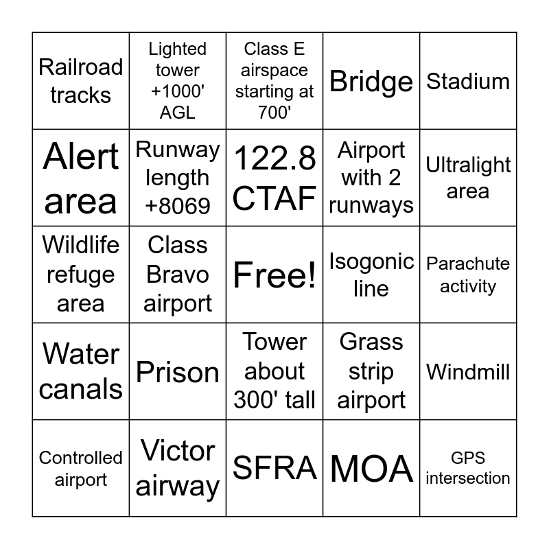 This bingo card has a free space and 34 words: Closed airport, MOA, Drag strip, VOR-DME, Water canals, Runway length +8069, Stadium, Controlled airport, Lighted tower +1000' AGL, TRSA, 122.8 CTAF, Class E airspace starting at 700', Class D airport, VORTAC, Isogonic line, Ultralight area, Victor airway, Wildlife refuge area, Prison, Grass strip airport, Tower about 300' tall, Golf course, Railroad tracks, Parachute activity, SFRA, GPS intersection, Bridge, Airport with a beacon, Airport with 2 runways, Alert area, Class E to the surface airport, Class Bravo airport, Windmill and Restricted area.